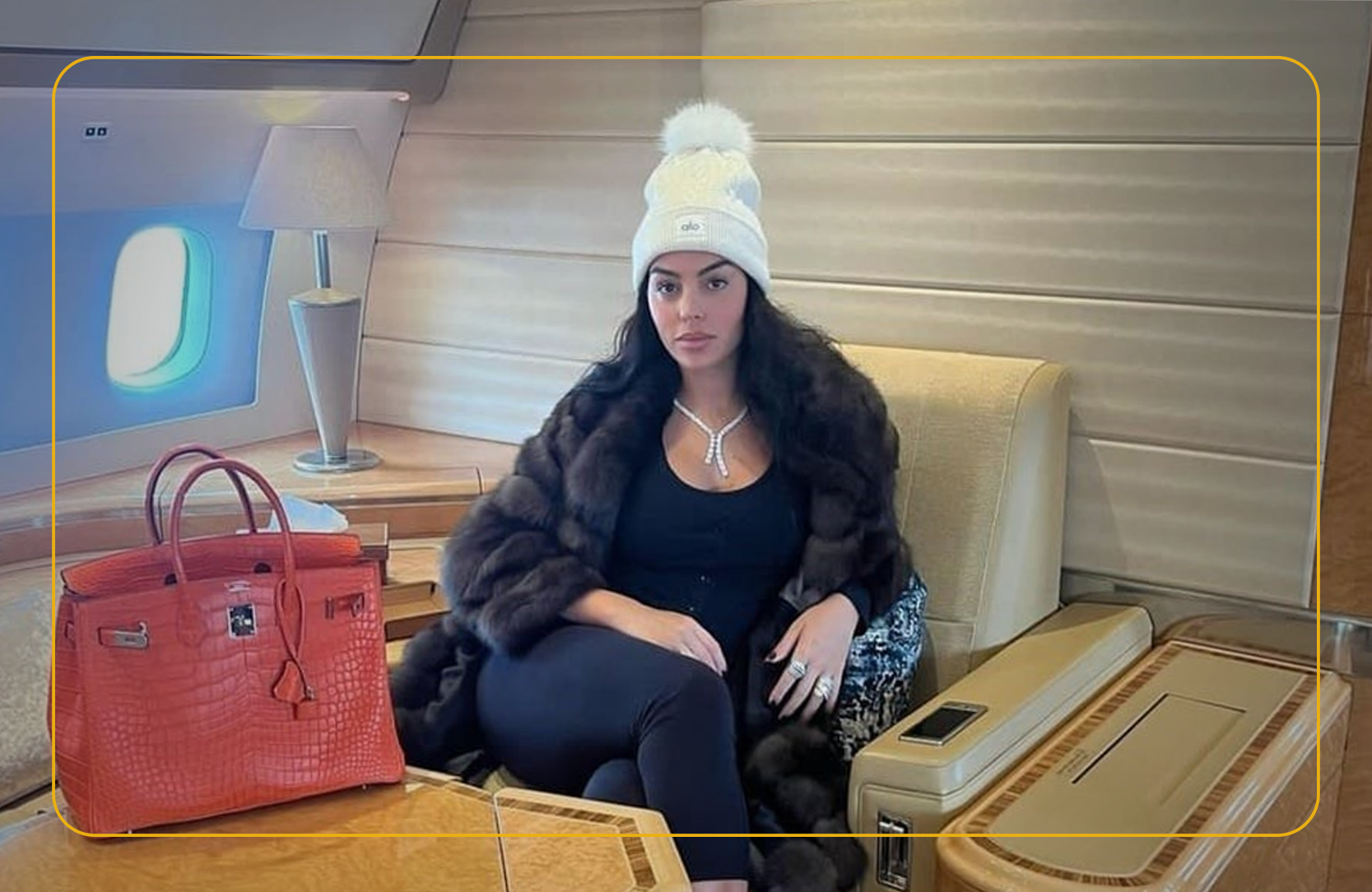 حيت أطلت جورجينا من الطائرة الخاصة برونالدو أثناء طريقهما للإقامة في المملكة، بإطلالة سوداء اللون، حيث اختارت “Leggings” ضيقاً مع توب” مكشوف من منطقة الرقبة، ونسقت معه معطف فرو بنفس اللون، وانتعلت حذاء رياضياً باللون الأبيض، ولم تستغنِ عن الحقيبة الشهيرة من “هيرميس” باللون البرتقالي.