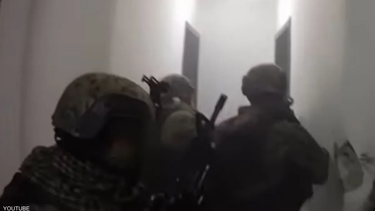 الفيديو مدته دقيقتان و43 ثانية، يظهر مجموعة من الرجال المسلحين بالزي الرسمي يقتحمون منزلا.