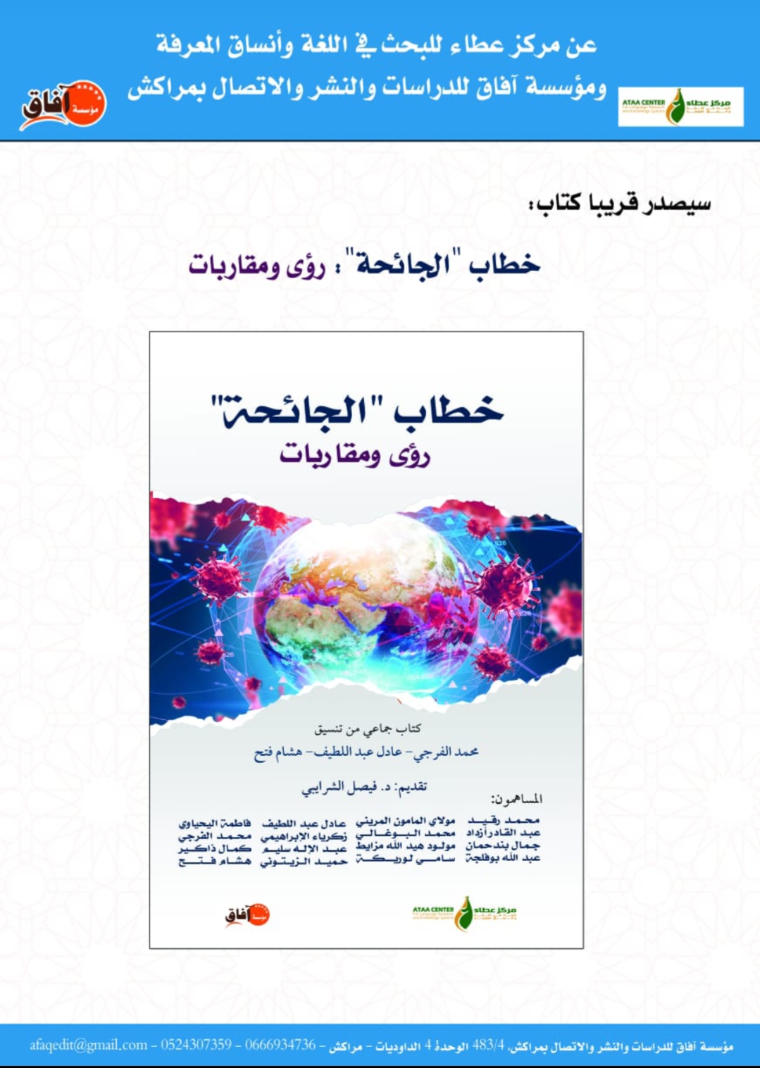 يستعد مركز عطاء للبحث في اللغة وأنساق المعرفة بمراكش في أيام قليلة لإصدار كتاب يحمل عنوان ” خطاب الجائحة، رؤى ومقاربات”.
