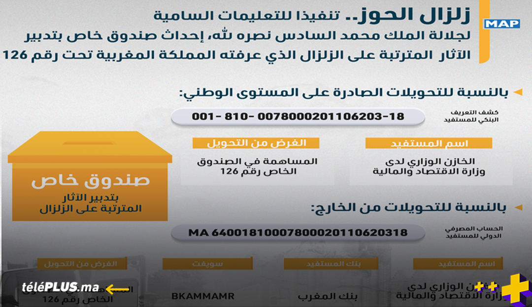 كشفت وزارة الاقتصاد والمالية عن طرق دفع المساهمات التطوعية التضامنية للصندوق رقم 126 الخاص بتدبير الآثار المترتبة على الزلزال الذي عرفته المملكة المغربية، والذي تم إحداثه تنفيذا للتعليمات الملكية السامية، وفي إطار الجهود الوطنية المبذولة لمكافحة آثار الزلزال الذي ضرب عددا من جهات المملكة.