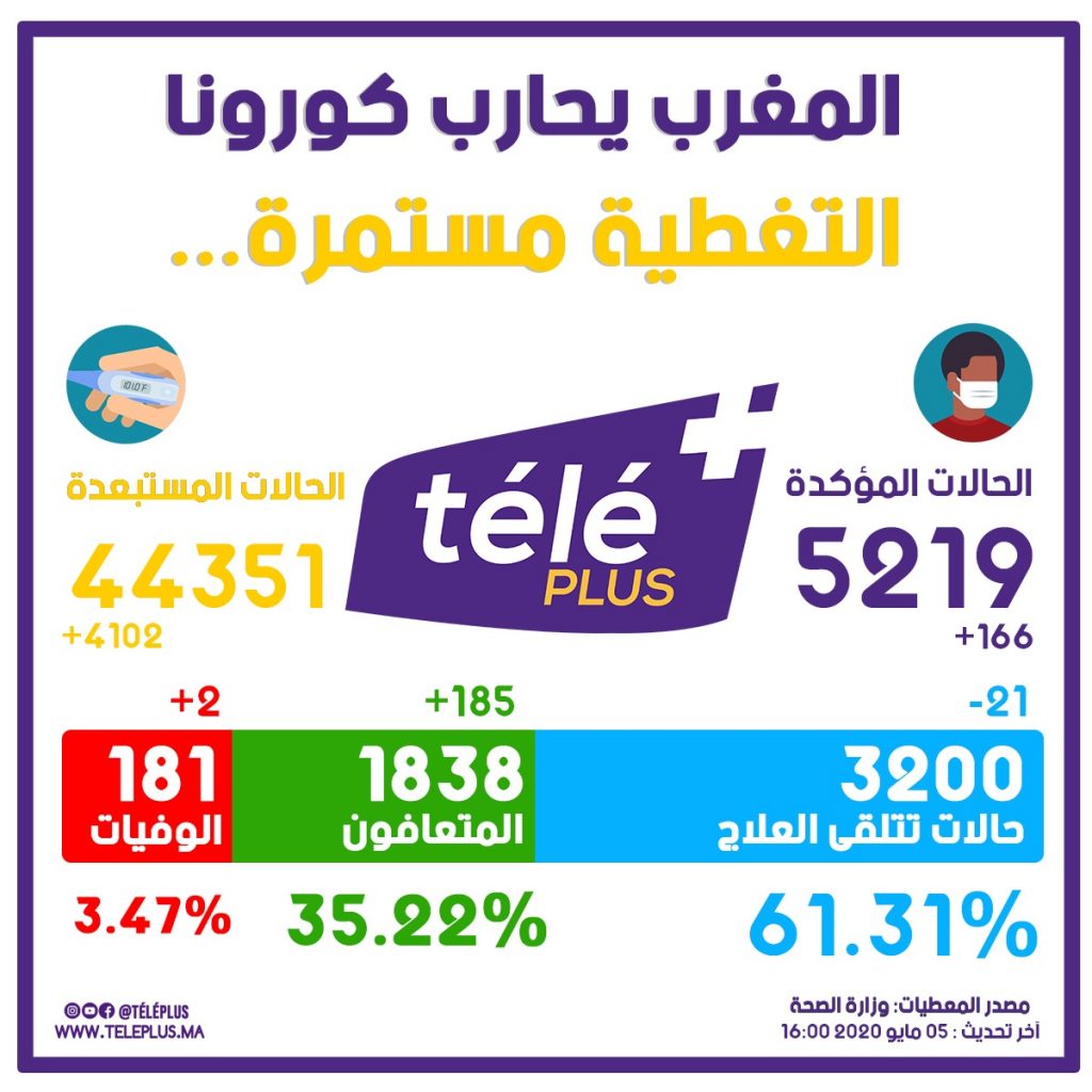 كشفت الأرقام الصادرة عن وزارة الصحة عن إرتفاع عدد حالات الإصابة المؤكدة بفيروس كورونا المستجد بالمغرب إلى 5219 حالة، إلى حدود الساعة الرابعة بعد ظهر اليوم الثلاثاء 05 ماي 2020، وذلك بعد تسجيل 66 حالة جديدة مؤكدة مخبريا.