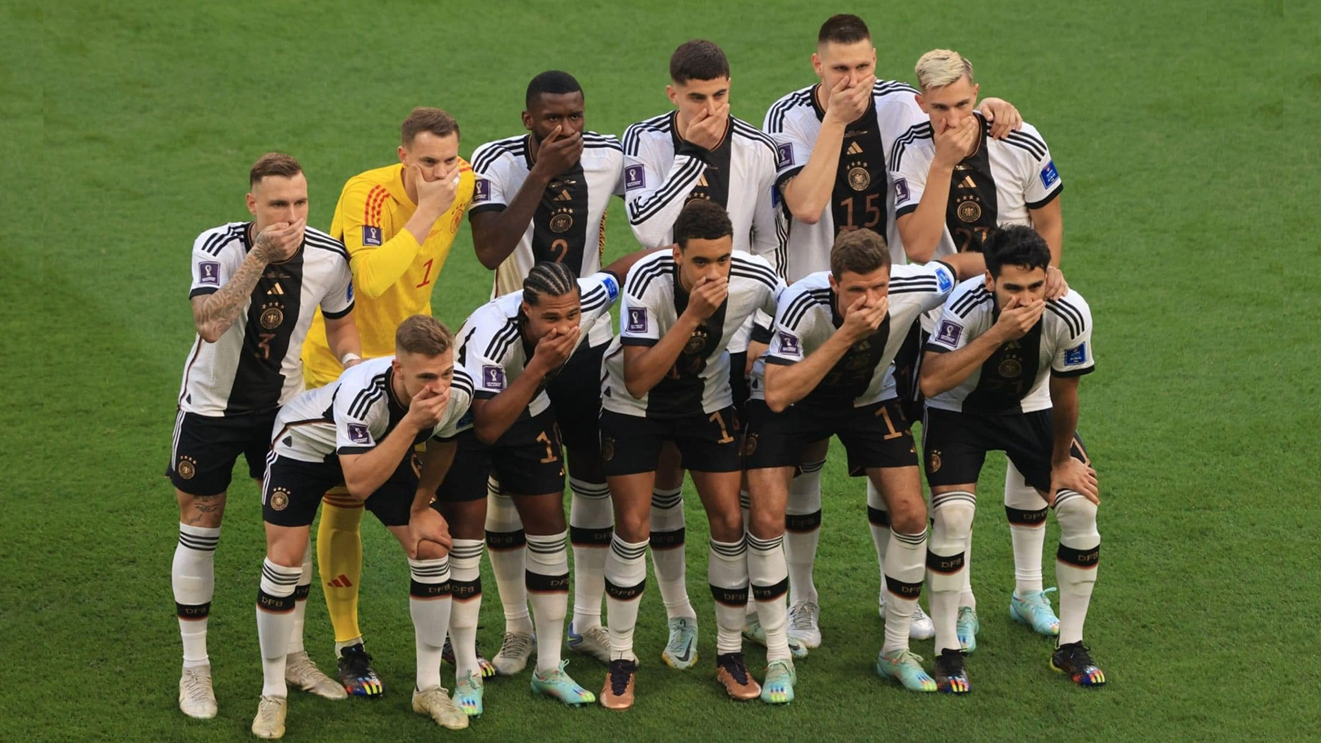 كمّ لاعبو المنتخب الألماني أفواههم خلال الصورة الرسمية قبيل مباراتهم مع اليابان في افتتاح منافسات المجموعة الخامسة بمونديال قطر 2022، فيما يبدو احتجاجاً على رفض الاتحاد الدولي لكرة القدم (فيفا) السماح لهم بارتداء شارات لدعم المثليين.