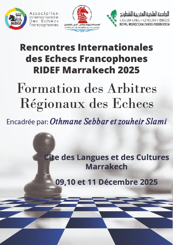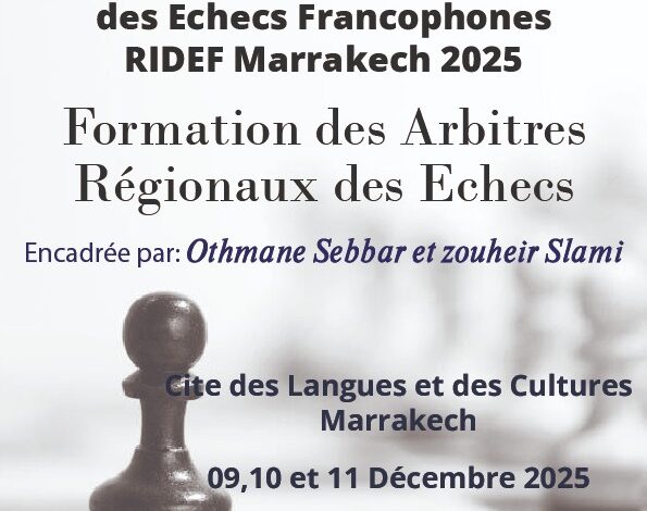 وفي إطار هذه التظاهرة الدولية المرموقة، أعلنت العصبة الجهوية مراكش آسفي للشطرنج عن تنظيم دورة تكوينية للحكام الجهويين خلال أيام 9 و10 و11 دجنبر 2025 بـ مدينة اللغات والثقافة التابعة لجامعة القاضي عياض من تأطير الحكمين الدوليين عثمان الصبار و زهير السلامي.