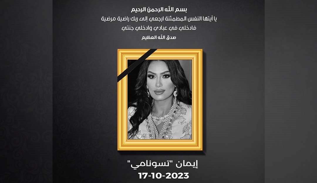 أعلن وكيل أعمال ايمان المشهورة فنيا بلقب” تسونامي” أسامة حكيم عن وفاتها هذا الصباح بسطوري نشره على حسابه الخاص بالأنسغرام .