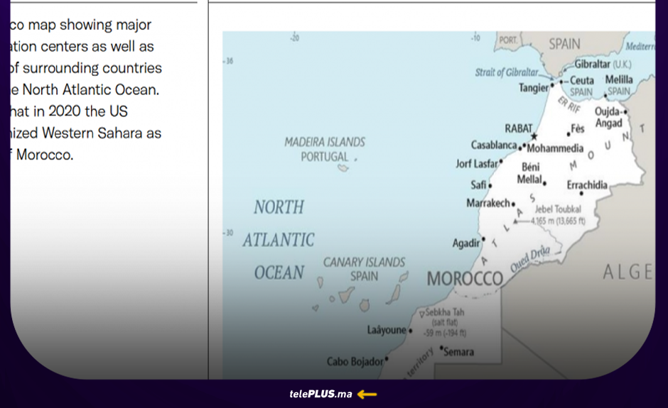 وعلى هامش الخريطة، أُرفق شرح جاء فيه: “تُظهر خريطة المغرب المراكز السكانية الكبرى، إلى جانب المناطق المجاورة والمحيط الأطلسي. يُذكر أنه في عام 2020، أقرت الولايات المتحدة بسيادة المغرب على الصحراء الغربية”.