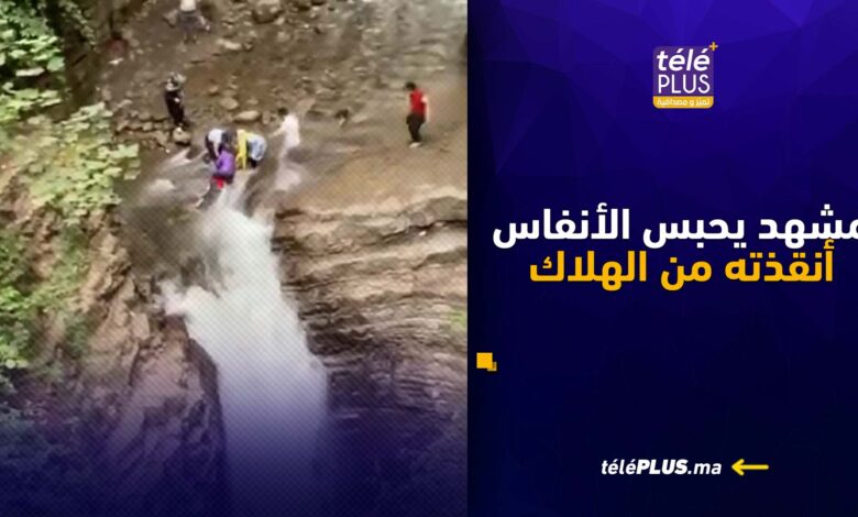 مشهد يحبس الأنفاس لسيدة تغامر بحياتها لإنقاذ إبنها من تدفع مياه إحدى الشلالات